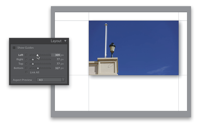 You do this pretty much the same way as you do everything else in Lightroom where there’s a layout option—your image fits inside a “cell,” and you can change the size of the cell to change the size of your image (since it has to fit inside that cell). You do that by going to the Layout panel (near the top of the right side Panels area) and moving the cell margins using the four sliders (Left, Right, Top, and Bottom). By default, they are linked, so if you move one side, they all move as a unit. If you want to create your own custom layout, start by clicking on Link All to unlink the margins, so now you can move each slider independently. As you move each slider, you’ll see your image move and resize, so just move them until you get to the size and position you want.