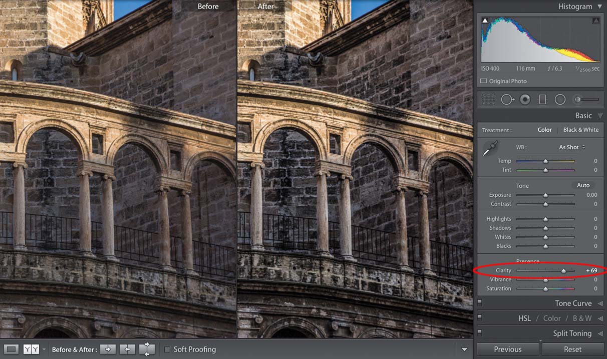 In the Develop module’s Basic panel, just drag the Clarity slider over to the right and any texture in the image gets immediately enhanced. Keep an eye on the screen as you drag this slider because if you drag too far with it, you’ll start to get a black glow or halo around the edges of objects in your image, which is warning you that you’re editing this image to death. How far you can go with it really just depends on the image—images like landscapes, cityscapes, automotive images, anything with lots of very well-designed hard edges can take lots of Clarity. Other images, like portraits or flowers or things of a softer nature, can sometimes take very little.