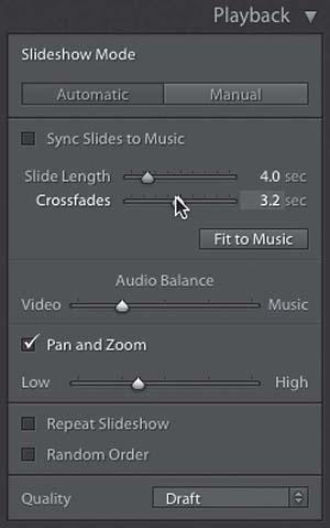 Go to the Playback panel (in the right side Panels area), and make sure the Sync Slides to Music checkbox is turned off. You’ll see the Crossfades slider and that lets you choose how long the fade between two images lasts (the farther you drag it to the right, the longer it takes).