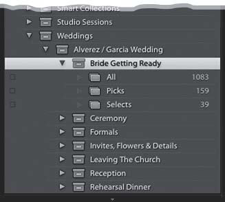 There is no “official” way to do this, but there are probably a dozen ways, so I’m going to share how I organize a big shoot like a wedding. The key here is using a collection set, which is basically one big main folder that all your individual collections go inside. For example, as soon as I’m back from the wedding, I would create a collection set and name it with the name of the wedding (for example, the Alverez/Garcia wedding). Then, I’d go ahead and create a bunch of collection sets inside of that main set right now (I’ll add the photos to them once I start sorting the images)—typical ones might be named: Rehearsal Dinner; Bride Getting Ready; Formals; Invites, Flowers & Details; Ceremony; Reception; Leaving The Church; and so on. Why are these collection sets? Because I’m going to need three collections inside of each. For example, inside the Bride Getting Ready collection set, you’d find three collections: (1) All (all the shots I took of the bride getting ready), (2) Picks (the shots inside this collection have a chance of making the final wedding album), and (3) Selects (these are the very best ones from the Picks collection, and are the ones that will be included in the wedding album or shared with the bride—these are the ones that get retouched, edited, and so on). Once those are in place, I import all the photos from the wedding, select big groups of images, and drag them into the appropriate collection sets. Then, I begin my process of going through the collections named “All,” marking the really good ones as Picks, then I turn on the Picks filter to see just those and drag them into my Picks collections. Now I start the narrowing down process again to find the “very best of the best.” Those go into my Selects collections.