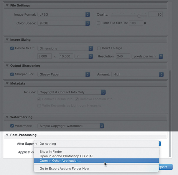 At the bottom of the Export dialog (Command-Shift-E [PC: Ctrl-Shift-E]) is the Post-Processing section, which is where you choose what happens to your image after it’s saved. Do Nothing means just that. If you want to open it in another application, including an email application or another editing app, choose Open in Other Application (as shown above). The Choose button below becomes active, and you can then choose the application you want (it actually opens a standard Open dialog, where you can navigate to the application you want, click on it, then click Choose, and that app will now be added to a pop-up menu to the left of the Choose button).