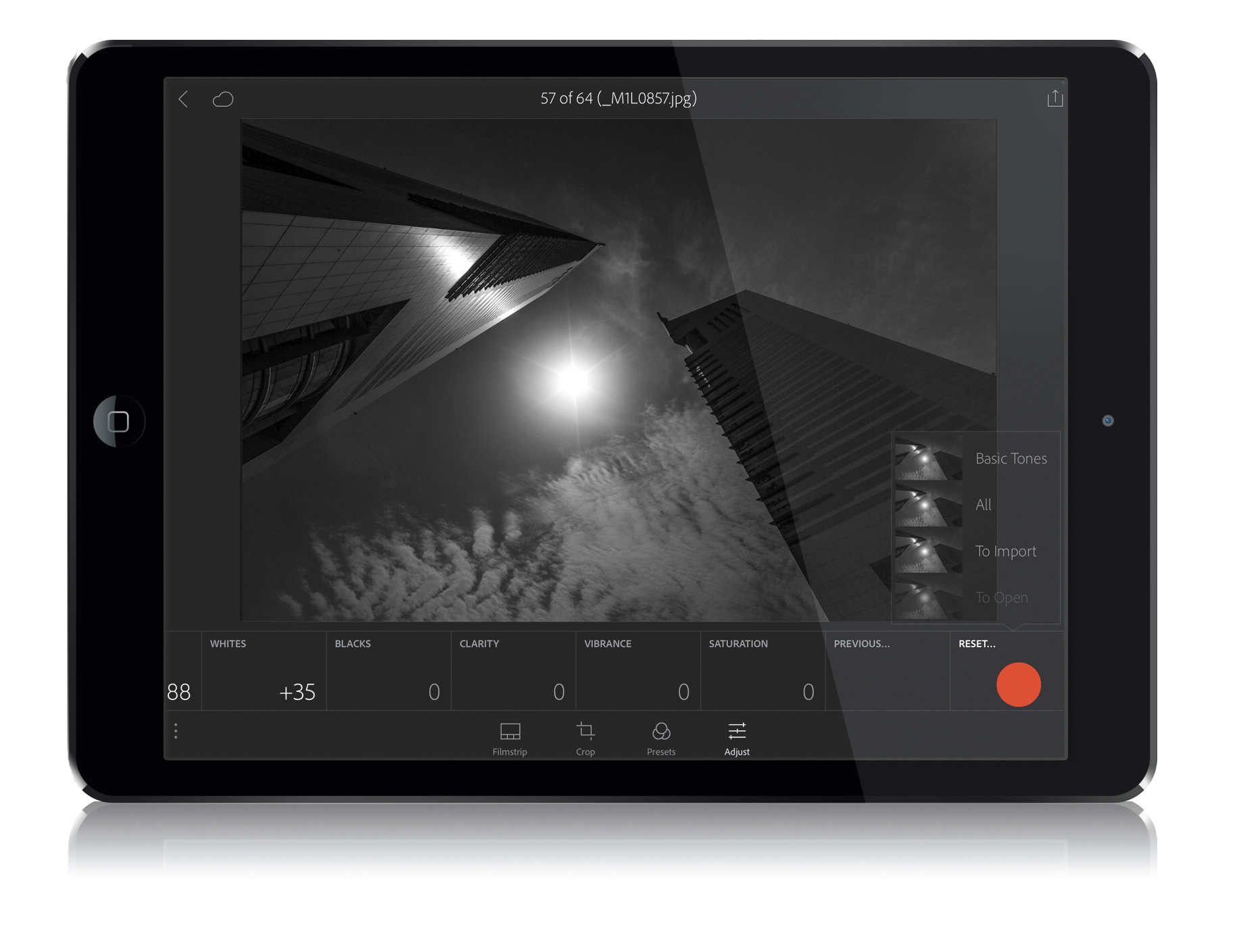 or you just wanted to experiment, etc.), swipe the tiles all the way over to the far right and tap the Reset tile (as shown above, marked in red). This brings up a pop-up menu where you can choose if you just want to reset the Basic Tones (leaving stuff like any cropping you did still in place), or All (which resets everything, including anything you did to the image in LR desktop before you brought it over to LR mobile), or To Import, which resets it to how it looked when you imported the image into LR mobile (so keeping the changes you made in LR desktop, but resetting everything you did to it once it was imported into LR mobile).