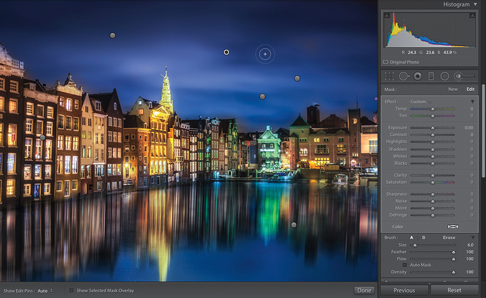 It’s an easy-to-remember shortcut: to hide the Edit Pins on your image in the Develop module, just press the letter H on your keyboard. To bring them back, just press H again. If you just want them hidden temporarily, press-and-hold H and they’ll stay hidden as long as you hold that key down. When you release the key, you can see the pins again.