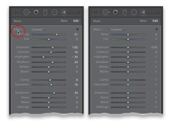 Just double-click directly on the word “Effect” near the top-left corner of the Adjustment Brush panel (in the Develop module’s right side Panels area; as shown here circled in red), and it resets all the sliders to 0 (as seen above right).
