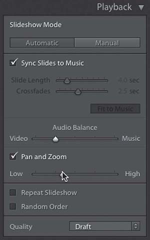 To add movement to your slide show, go to the Playback panel (in the right side Panels area) and turn on the Pan and Zoom checkbox. Right below that, you’ll find a slider that goes from Low to High (Low means a little movement and High means a lot, so use that slider to choose how much movement you want). Once your slide show starts, Lightroom will move the images from left to right (and right to left), and at the same time, it will zoom in on the images. The two together work pretty well to create movement and the default dissolve effect that happens between slides helps add to the overall effect.