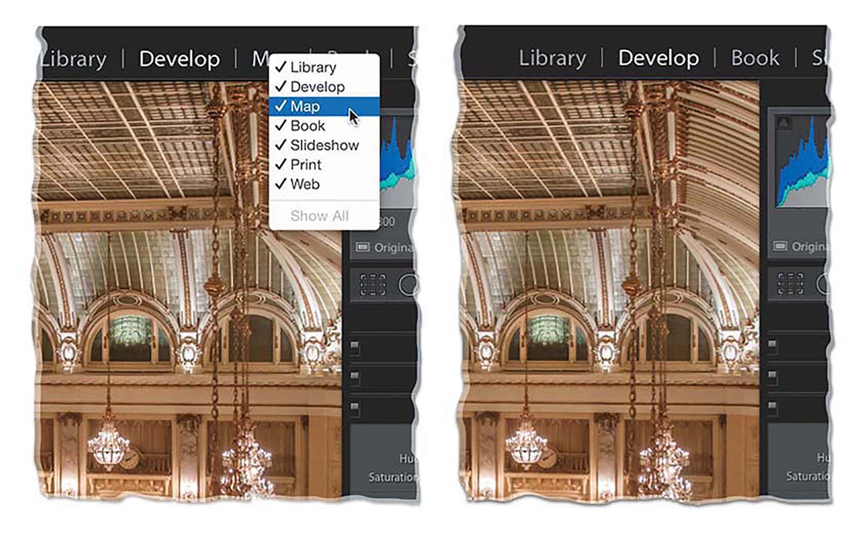 Just Right-click on any module’s name up in the taskbar (as shown above), and a pop-up menu appears with a list of all the modules. By default, they’re all checked because they’re all visible. To hide any one you don’t use (for example, I don’t use the Map module), just click on it to deselect it, and now that module is hidden. Don’t worry, if one day