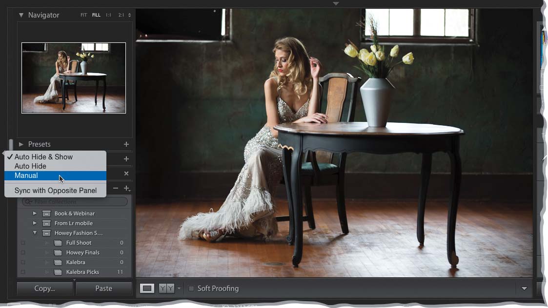 Just Right-click directly on any of the little arrows at the center edges of Lightroom and a pop-up menu will appear. That “panel popping” is called, “Auto Hide & Show” and to stop it from poppin’, just choose Manual from this pop-up menu (you have to do this for each individual panel you want to stop poppin’). Now, to open or close a panel, you’ll click once on that same arrow at the edge of the panel you want to open/close. Not Right-click; just click once to open/close. How to turn off this “Auto Hide & Show” is one of the most frequently asked questions I get.
