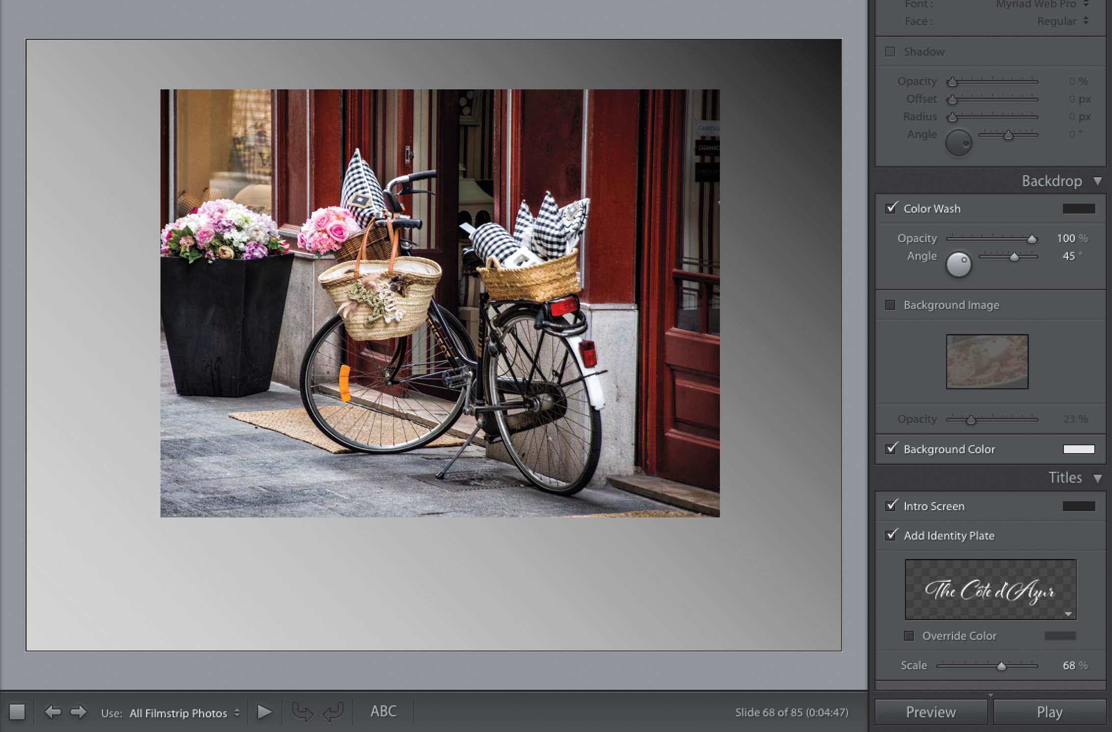 Go to the Backdrop panel, in the right side Panels area, and you’ll see the Background Color checkbox at the bottom. Click on the color swatch to the right to bring up the Background Color picker, where you can choose any background color you’d like (by default, it’s going to look like you can only choose black, white, or shades of gray, but if you click-and-drag the HEX slider on the far right upward, you’ll see all the colors appear). Besides a solid color, if you leave the Color Wash checkbox (at the top of the panel) turned on, you’ll get a background gradient that graduates from the Color Wash color (you pick this by clicking on its color swatch) to whichever color you have chosen for the Background Color. So, as you can see above, I went from the black Color Wash to a gray Background Color. Up near the top of the panel, you can also choose the direction of your gradient by clicking-and-dragging on the Angle dial.